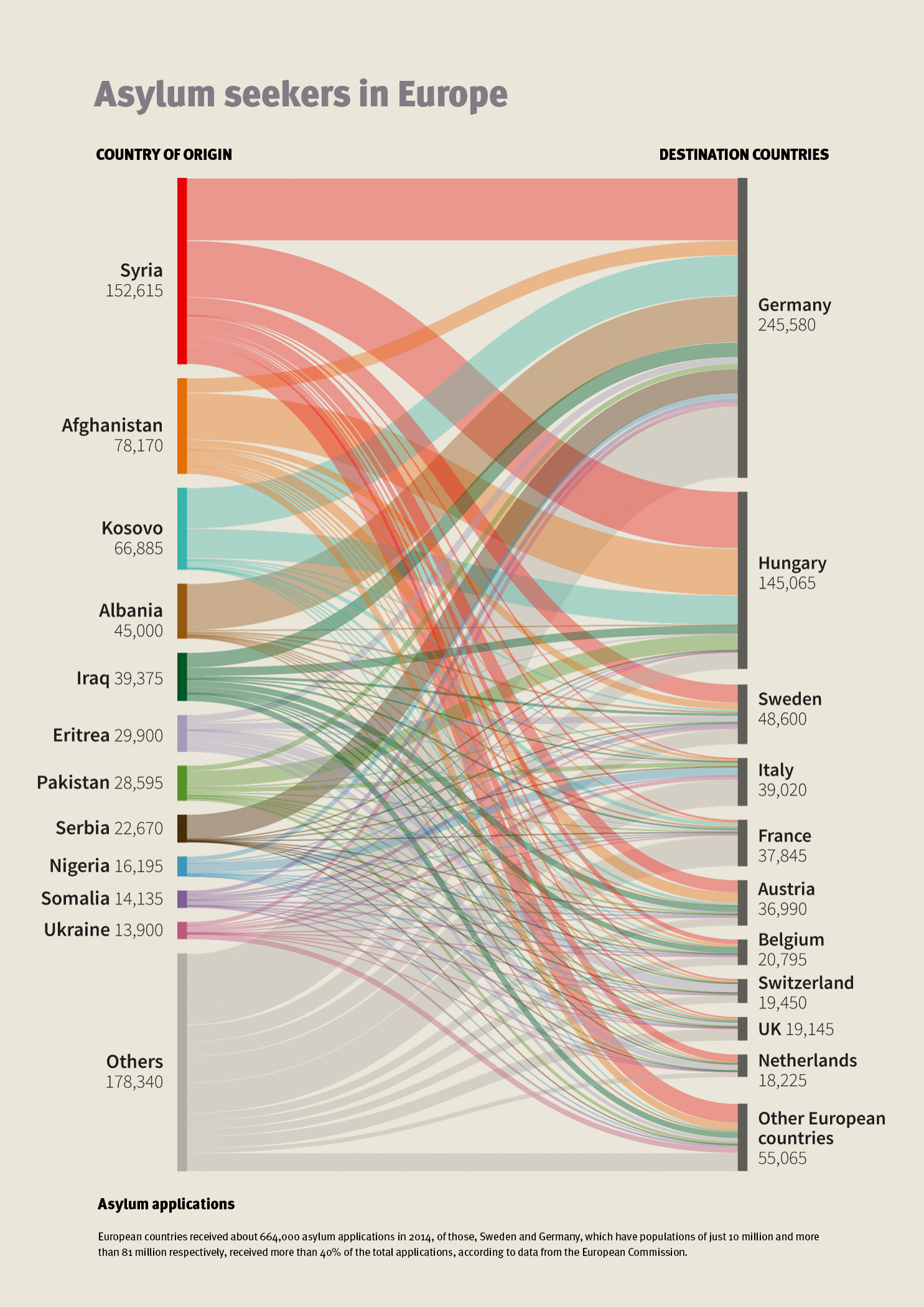 Data visualisation of asylum seeker patterns and migration flows across Europe.