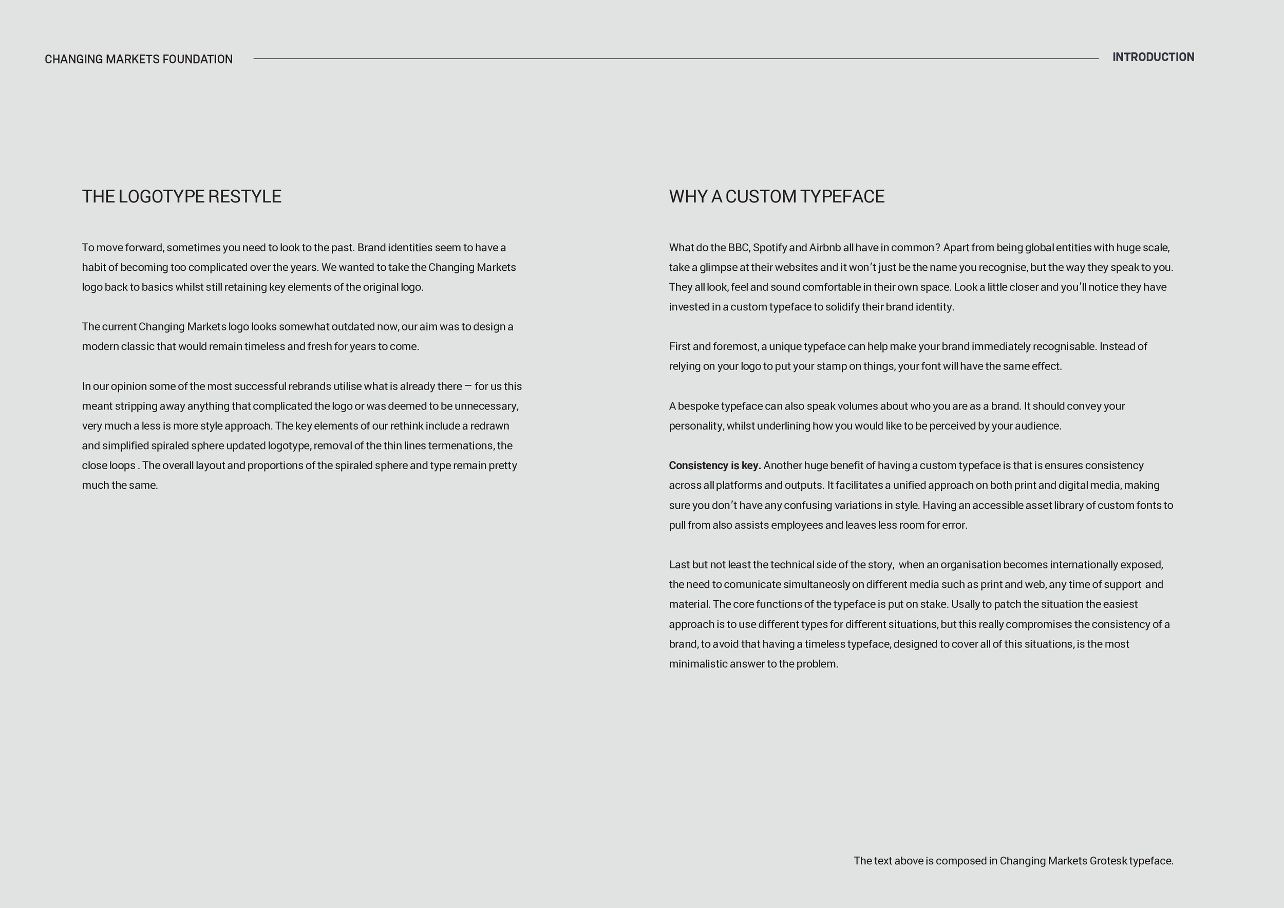 Custom typeface and visual identity design for Changing Markets Foundation.