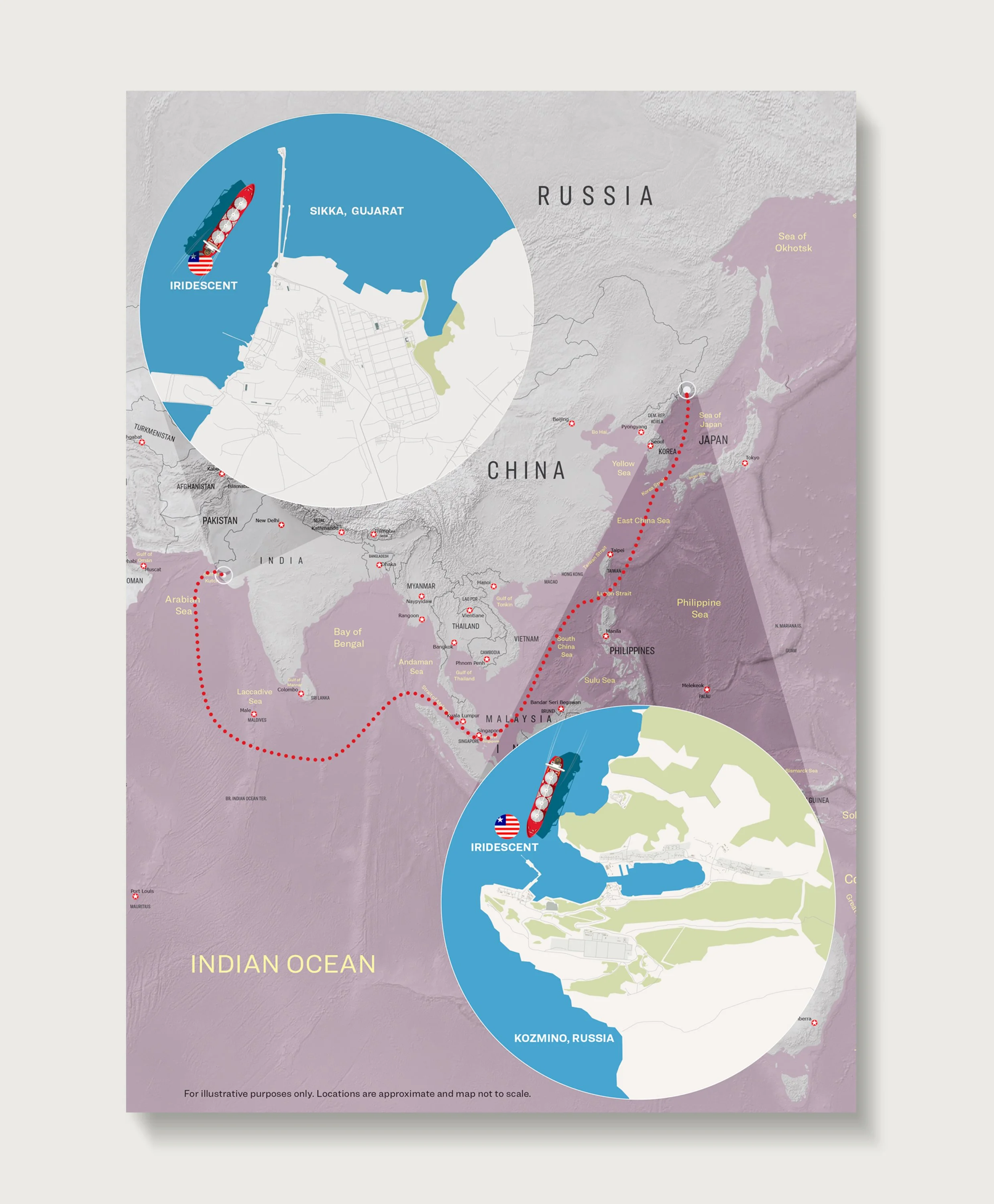 Cartographic tracking of the oil tanker Iridescent and its controversial maritime routes.
