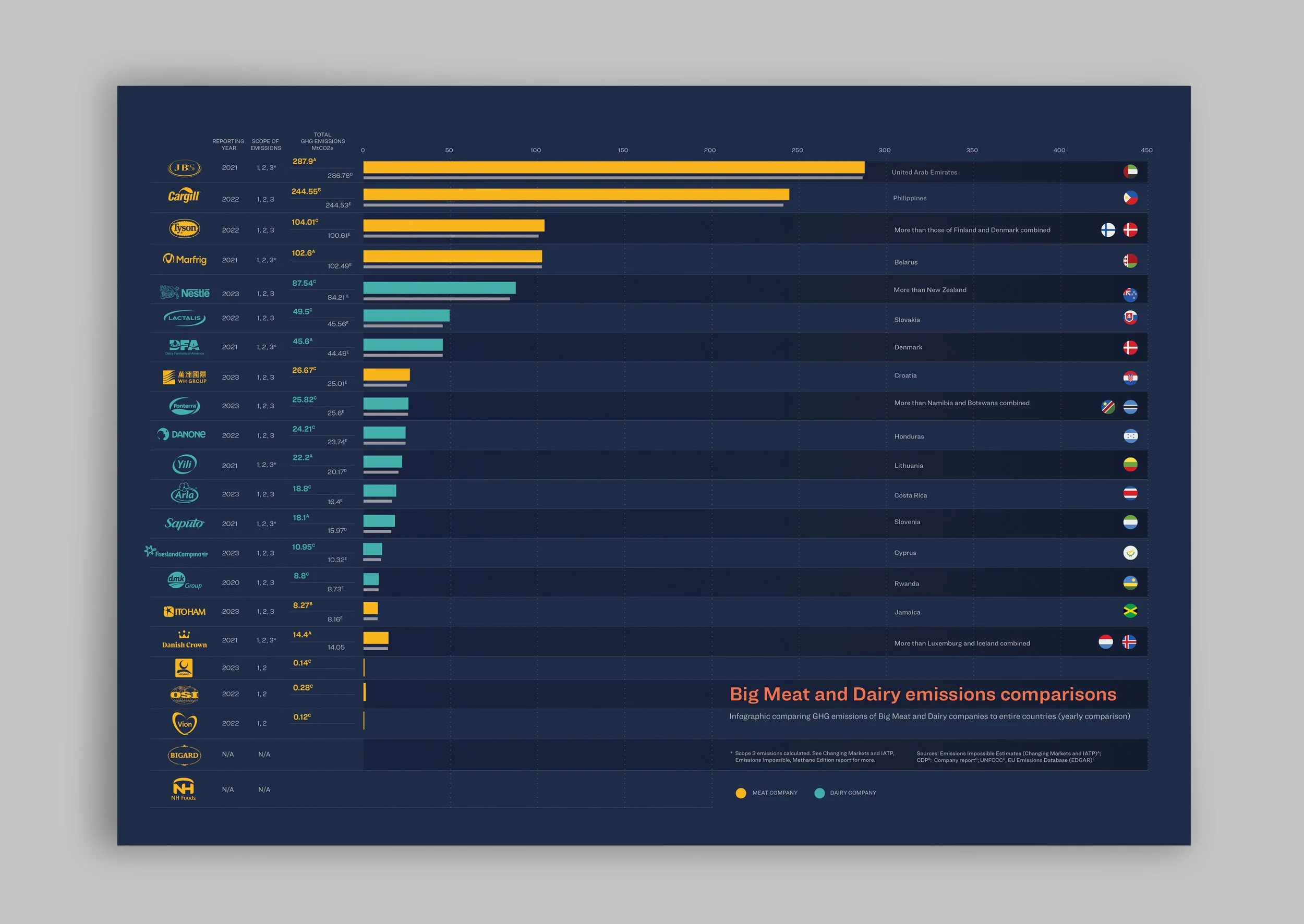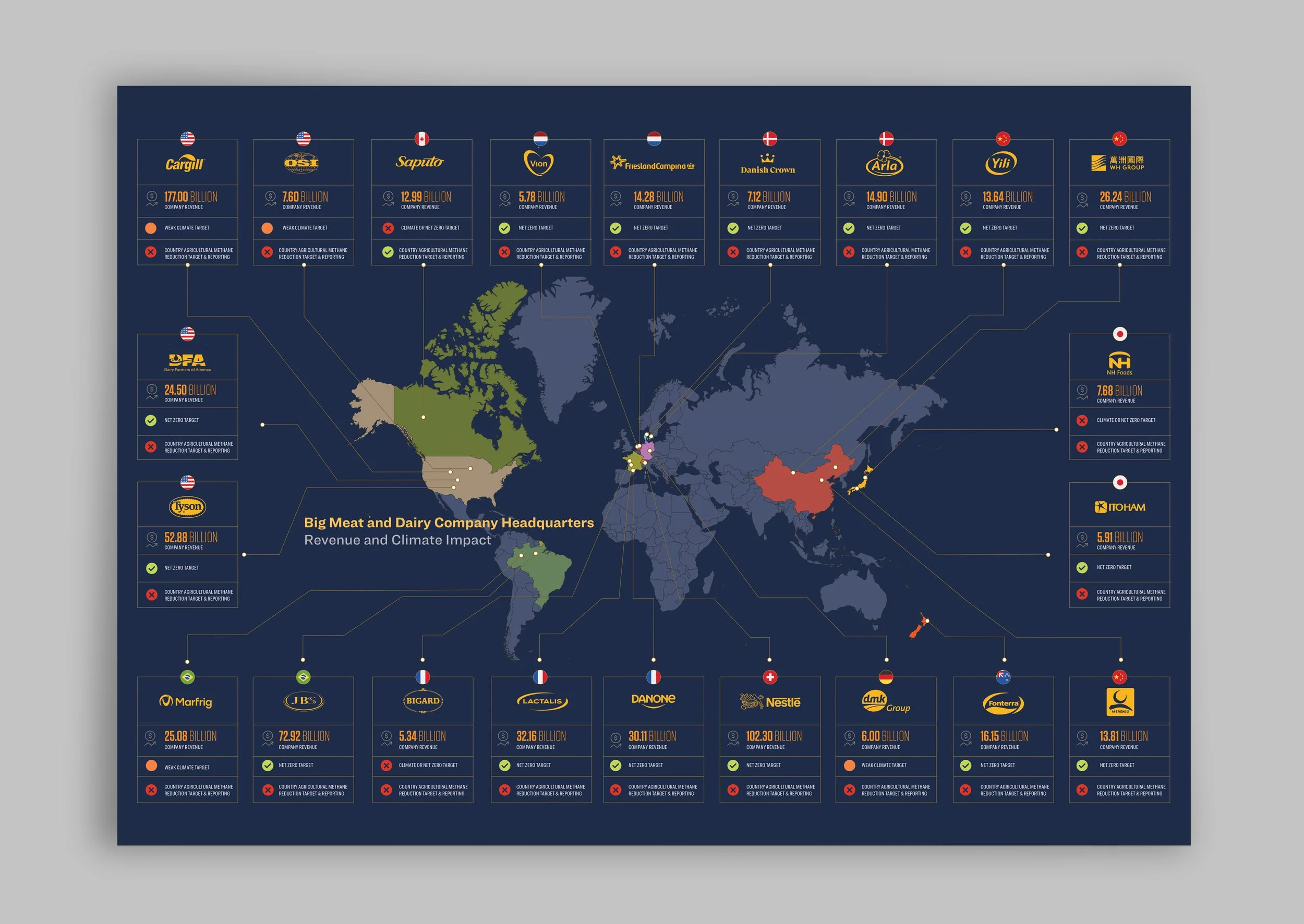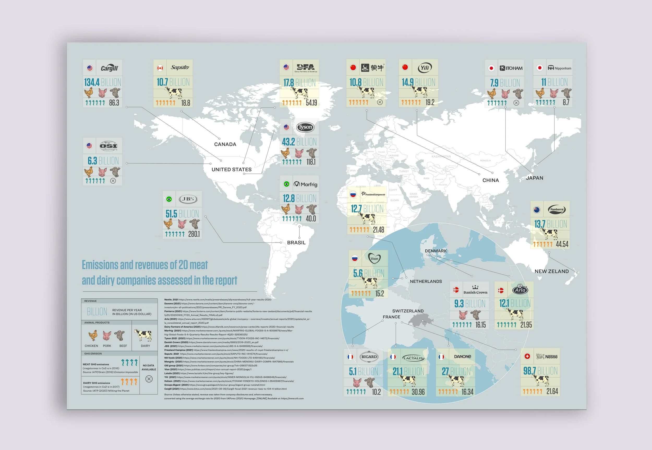 Mapping the headquarters, emissions and revenues of the world largest meat and dairy corporations.